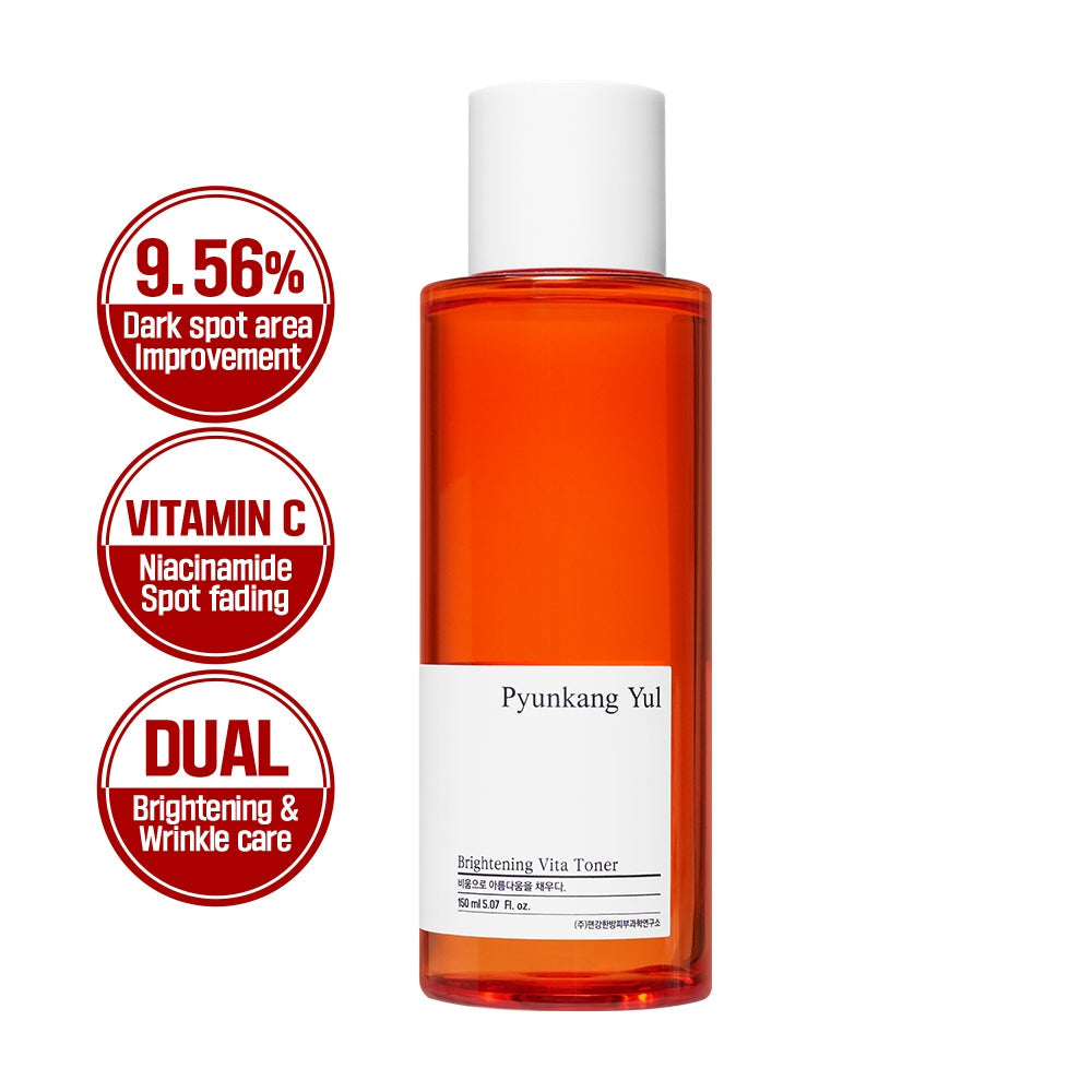 Pyunkang Yul Brightening Vita Toner is a revitalizing K-beauty toner that combines brightening and hydrating ingredients to reveal a glowing, even-toned complexion. Formulated with pure Vitamin C (ascorbic acid), this toner fights free radicals, improves skin firmness, and boosts collagen production. Niacinamide and adenosine target uneven skin tone, fine lines, and dullness, leaving your skin radiant and youthful. Enhanced with pearl extract and mulberry root, the toner visibly reduces blemishes, acne scars, and dark spots. Panthenol and two types of hyaluronic acid deliver 24-hour hydration, helping maintain a smooth and dewy finish. Clinically proven to improve skin texture by 7.48%, this water-light formula absorbs quickly without stickiness. EWG green-grade ingredients make it ideal for sensitive skin, staying true to Pyunkang Yul’s minimal, effective skincare philosophy. Whether your concern is dullness or dryness, this toner restores moisture and glow to tired, lifeless skin.